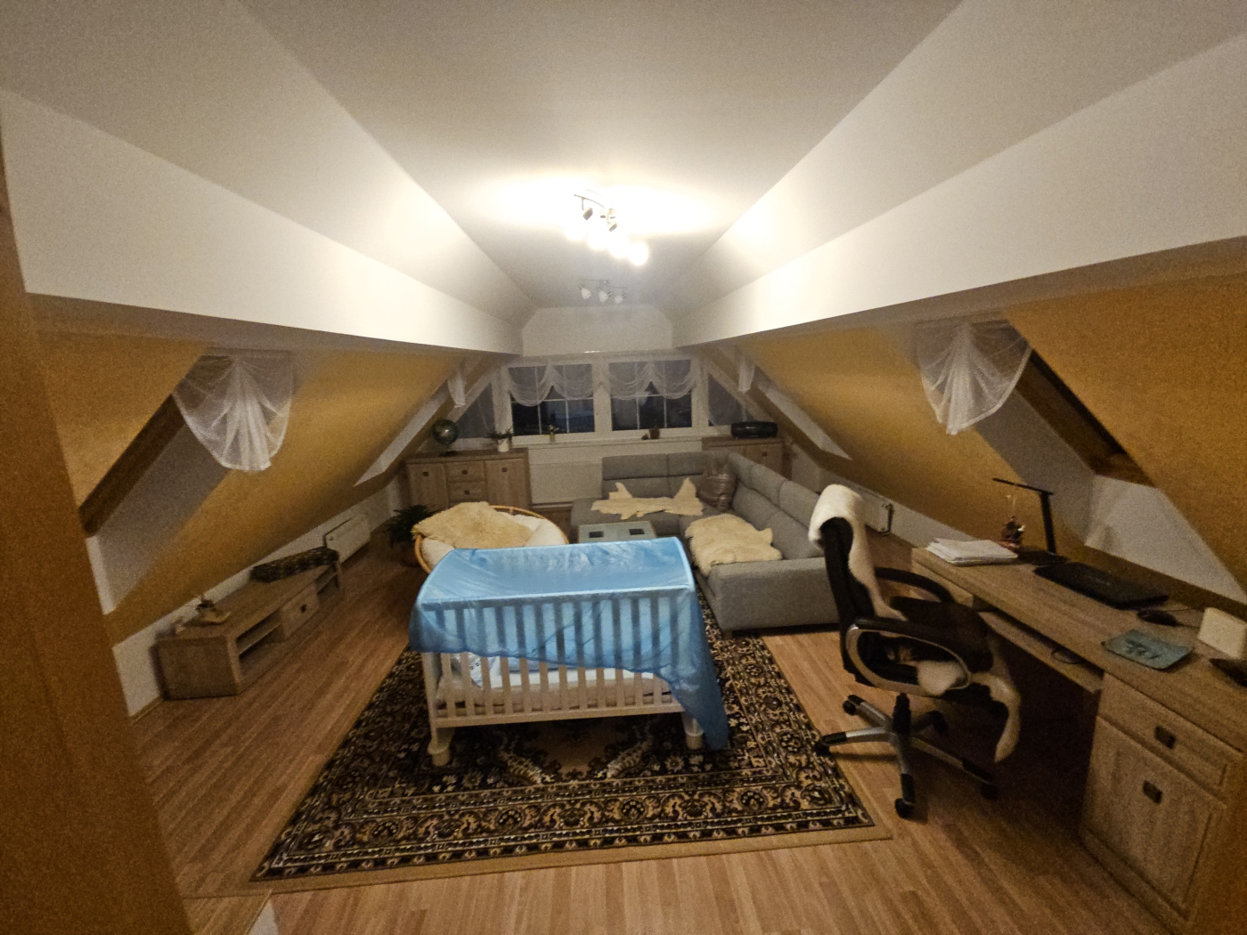 V 1. NP je ložnice se šatnou, dětský pokoj se šatnou, koupelna s WC a herna. V mezipatře je vstup na půdu.